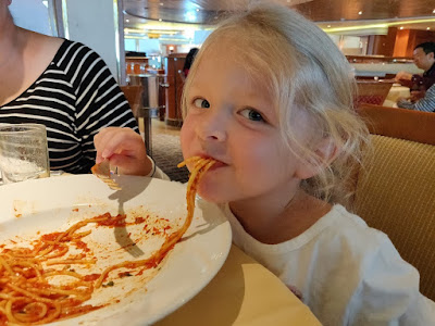 In the main dining room, the girls were in love with kids spaghetti, although Vivian would occasionally branch out if there was a steak on the menu.